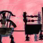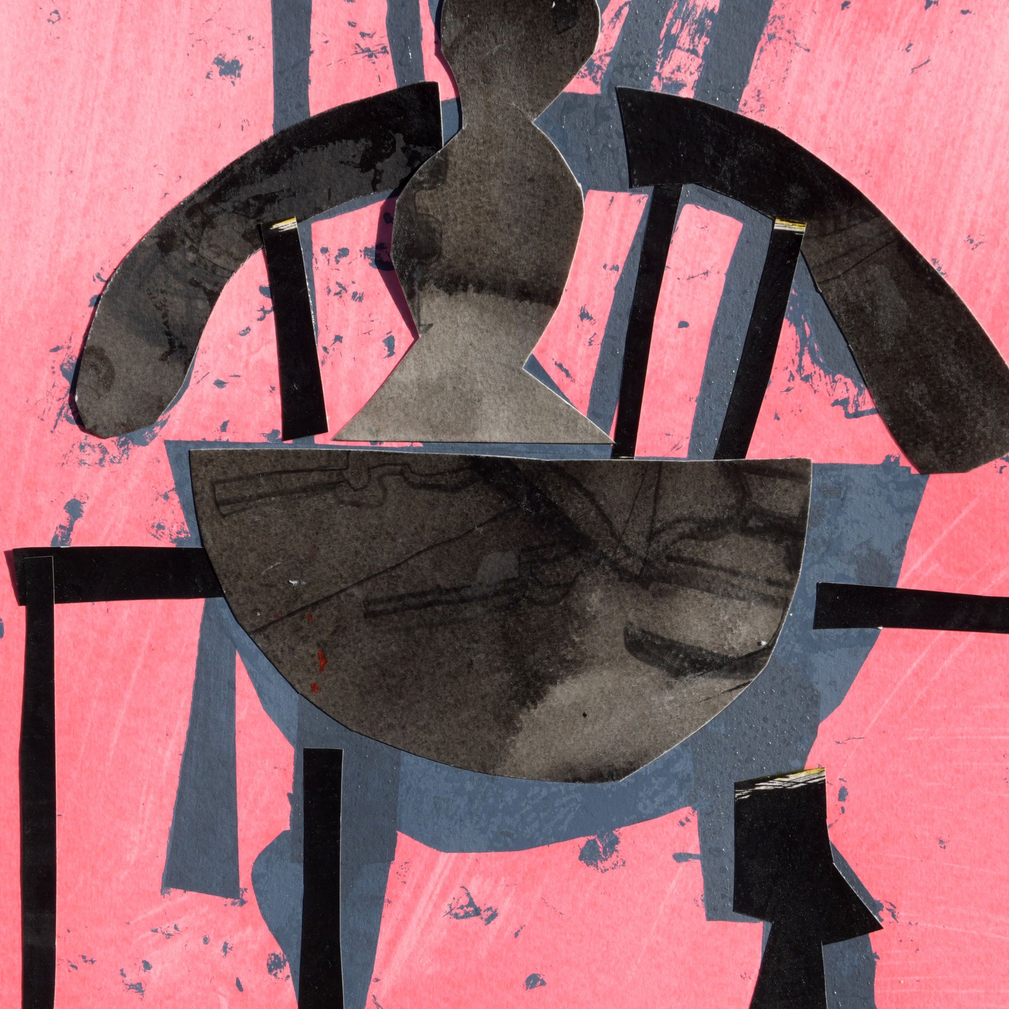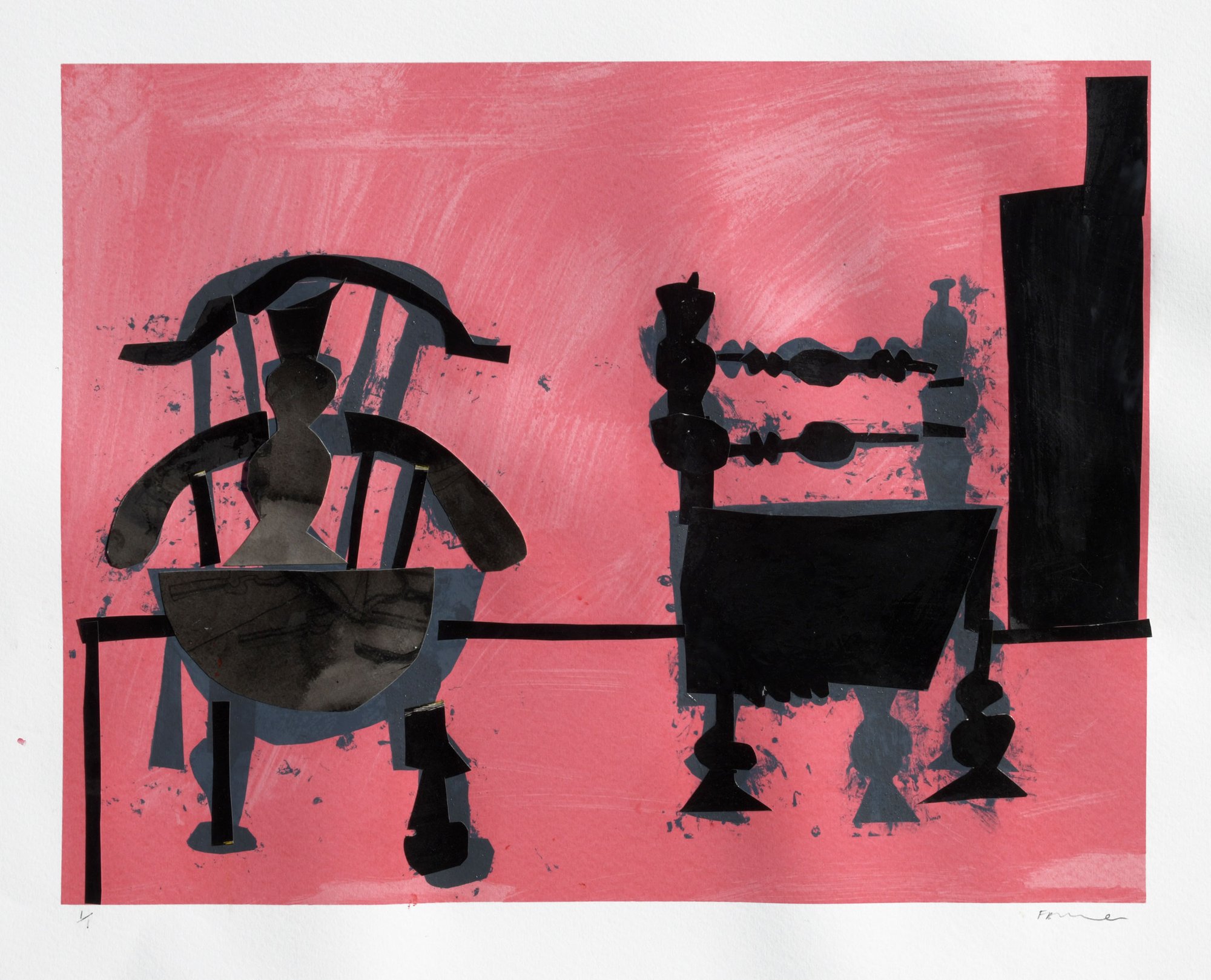 A unique 1/1 collage/silkscreen print by Florence Hutchings, this work presents a more subdued yet richly textured exploration of form and contrast. Two central, chair-like silhouettes—rendered in deep charcoal and layered crimson—anchor the composition, their shapes echoing both furniture and abstracted figures. The interplay between these forms suggests a quiet dialogue, balanced across the open expanse of the paper.